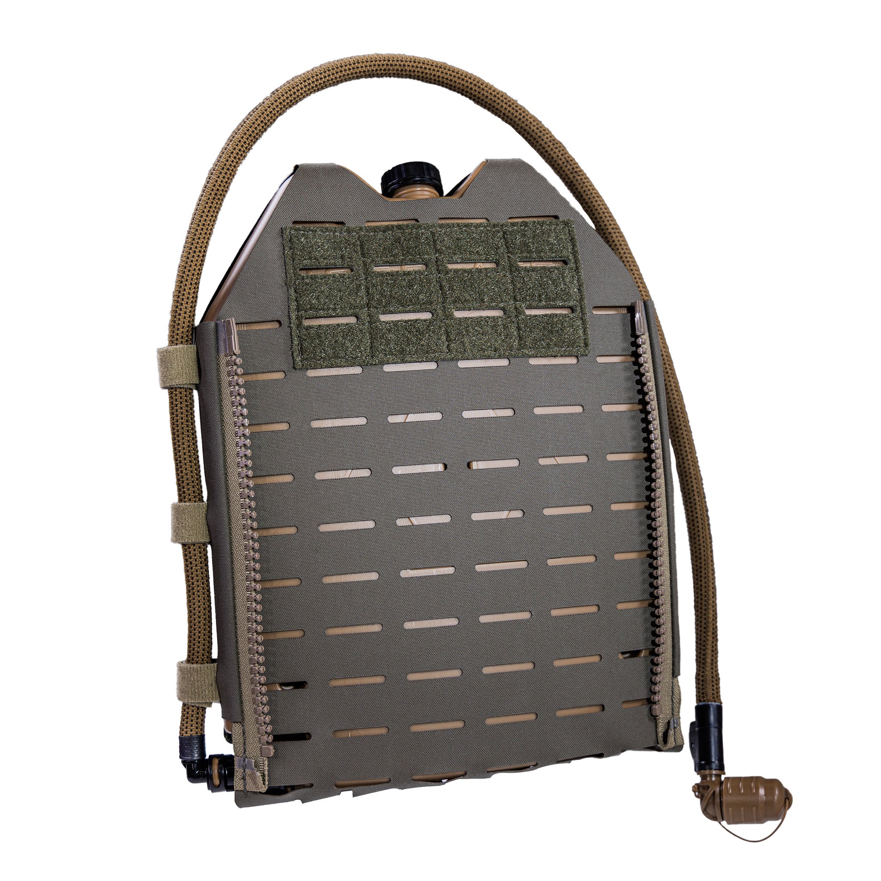 It features four fixed MOLLE straps, three removable one-wrap loops for drink tube management, a 6"x3" loop field for identification patches, full laser cut PALS on the outside and bottom for pouch attachment and Crye-pattern zippers for attaching zip-on back panels.